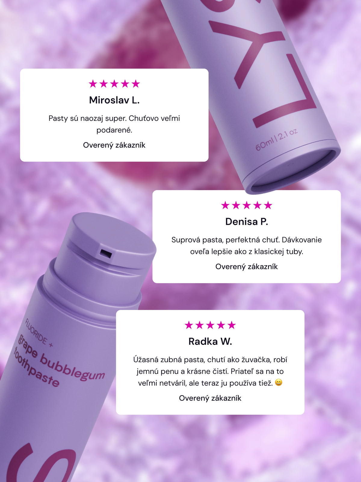Vráť sa do detstva s príchuťou hroznovej žuvačky. Naša pasta na zuby ti prinesie hravú chuť a maximálnu starostlivosť o tvoj úsmev v jednom.