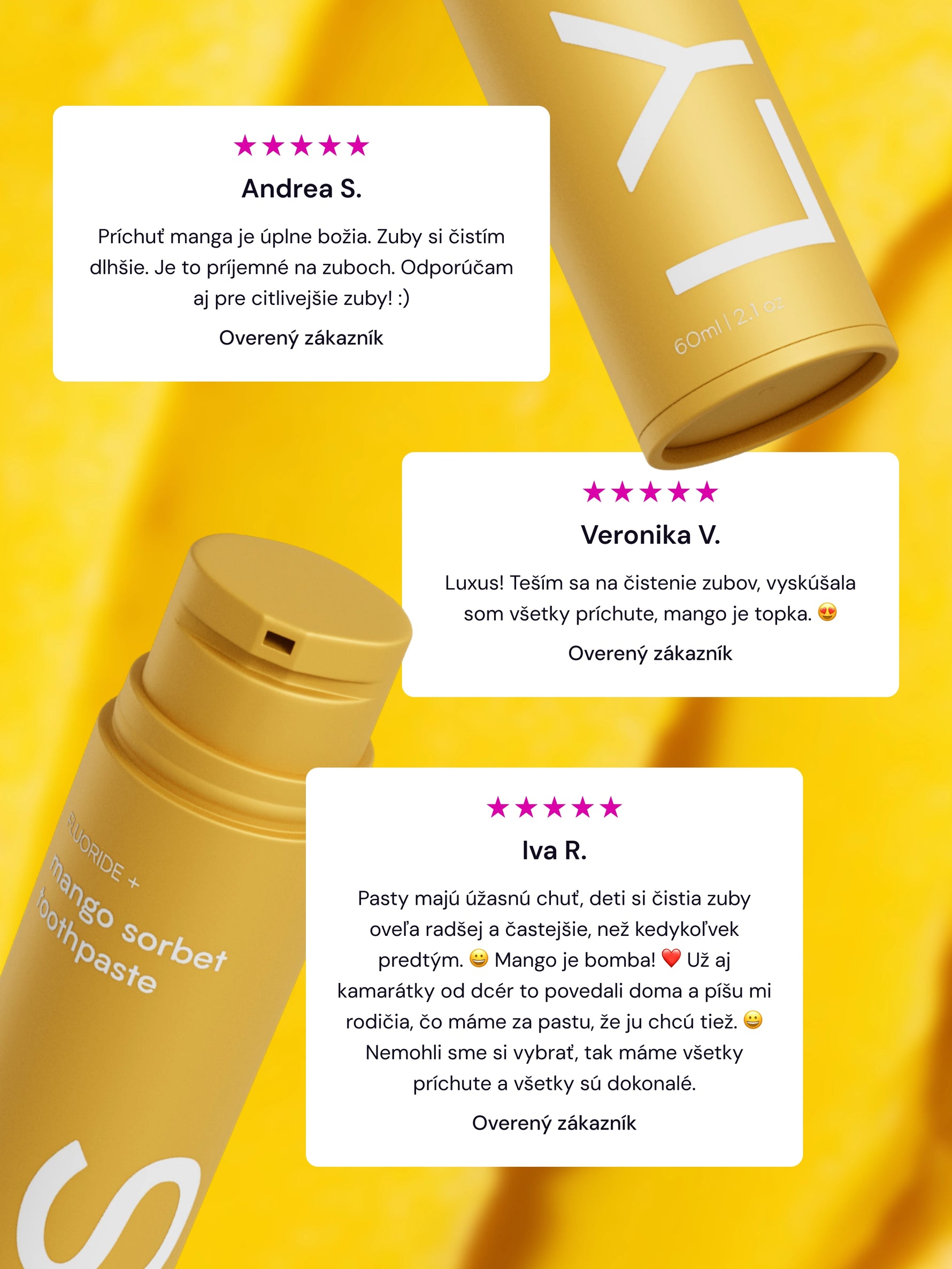 Dopraj si tropické osvieženie s mangovým sorbetom. Naša pasta na zuby zložená zo starostlivo vybraných ingrediencií ti dodá chuť užívať si aj tú najbežnejšiu rutinu.