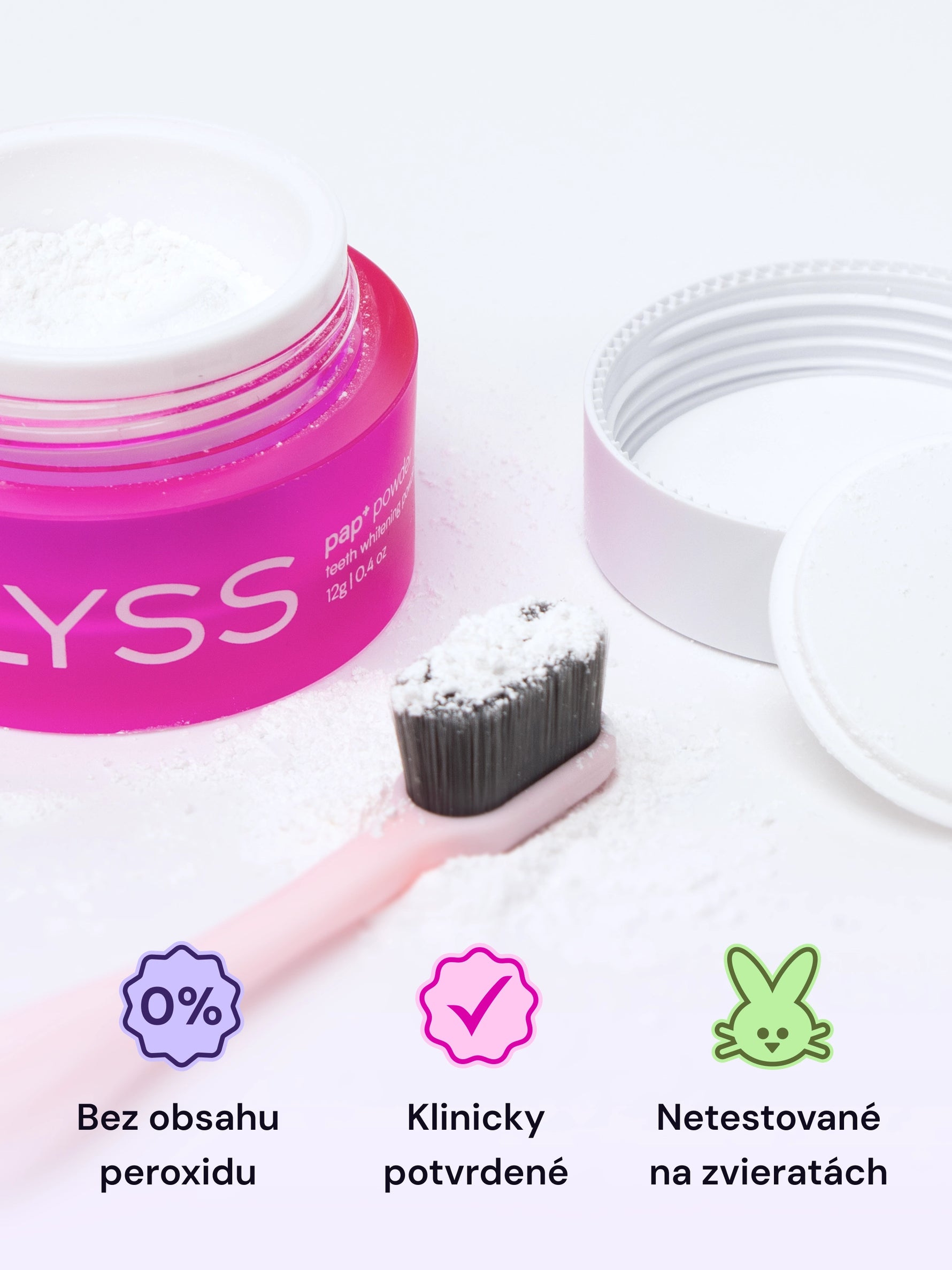 Áno, PAP+ bieliaci púder je úplne bezpečný pre tvoju sklovinu aj ďasná. Nepoužíva drsnú abrazívnu metódu bielenia. Namiesto toho oxiduje škvrny na zuboch pomocou aktívnej bieliacej zložky PAP, ktorá poskytuje účinné výsledky bez zvýšenej citlivosti, podráždenia ďasien alebo narušenia skloviny.