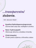 PAP+ bieliaci pásik sa po priložení pevne prichytí na povrch zuba a začne uvoľňovať aktívne zložky PAP do štruktúry zuba, čím zabezpečuje rýchle a efektívne bielenie, znižovanie citlivosti zubov a dodanie potrebných minerálov.