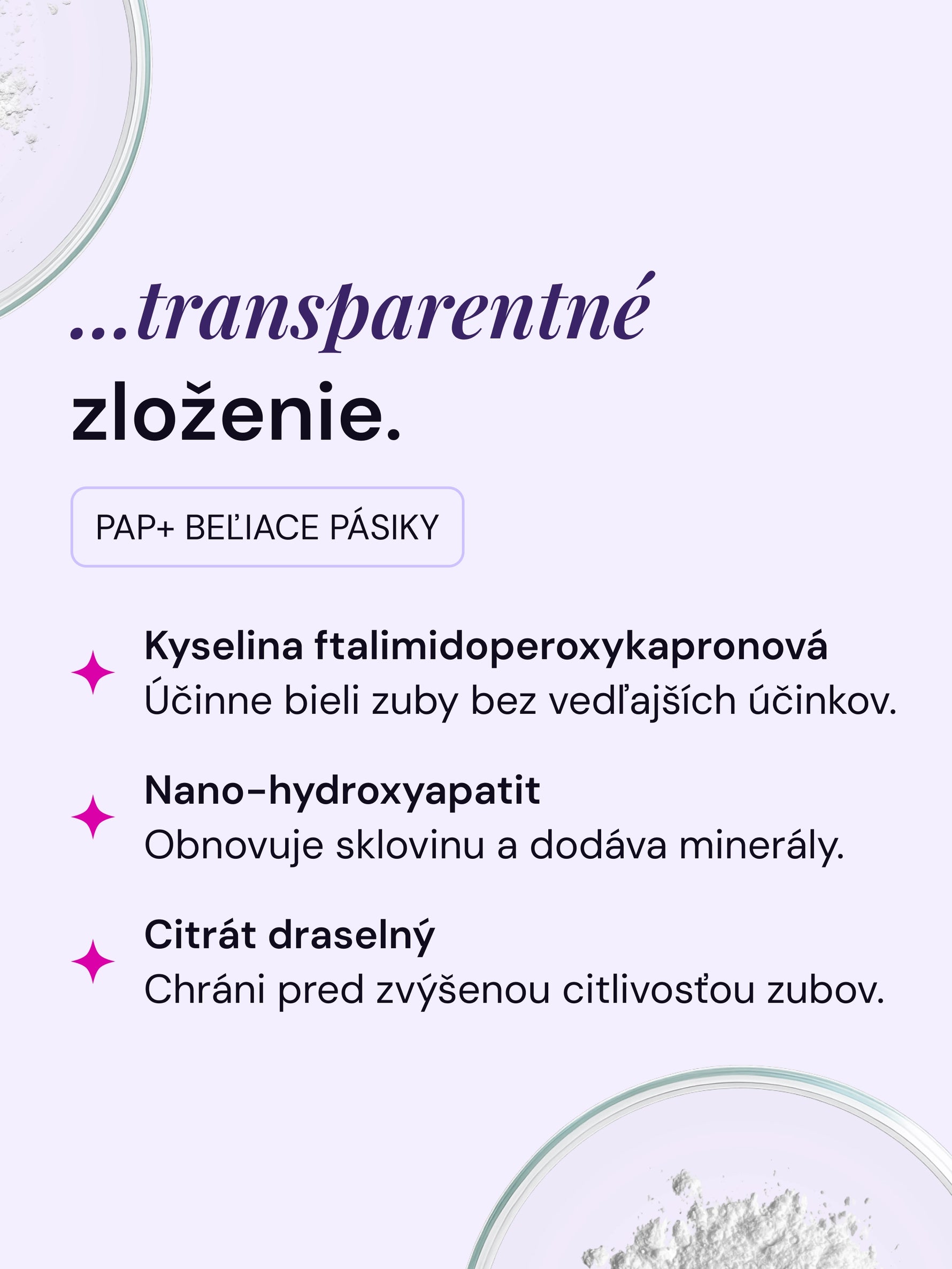 Nie. Tradičné bieliace pásiky fungujú na báze peroxidu, ktorý spôsobuje zvýšenú citlivosť zubov. Bieliace pásiky PAP+ namiesto toho používajú zloženie na báze PAP, ktoré citlivosť zubov nespôsobuje.