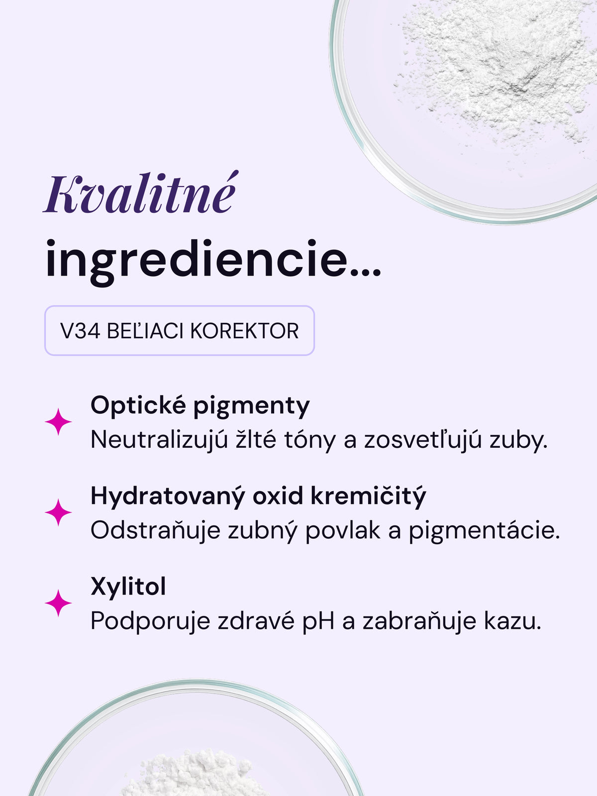 Nie, náš farebný korektor neobsahuje peroxid vodíka, ktorý môže poškodiť zubnú sklovinu.