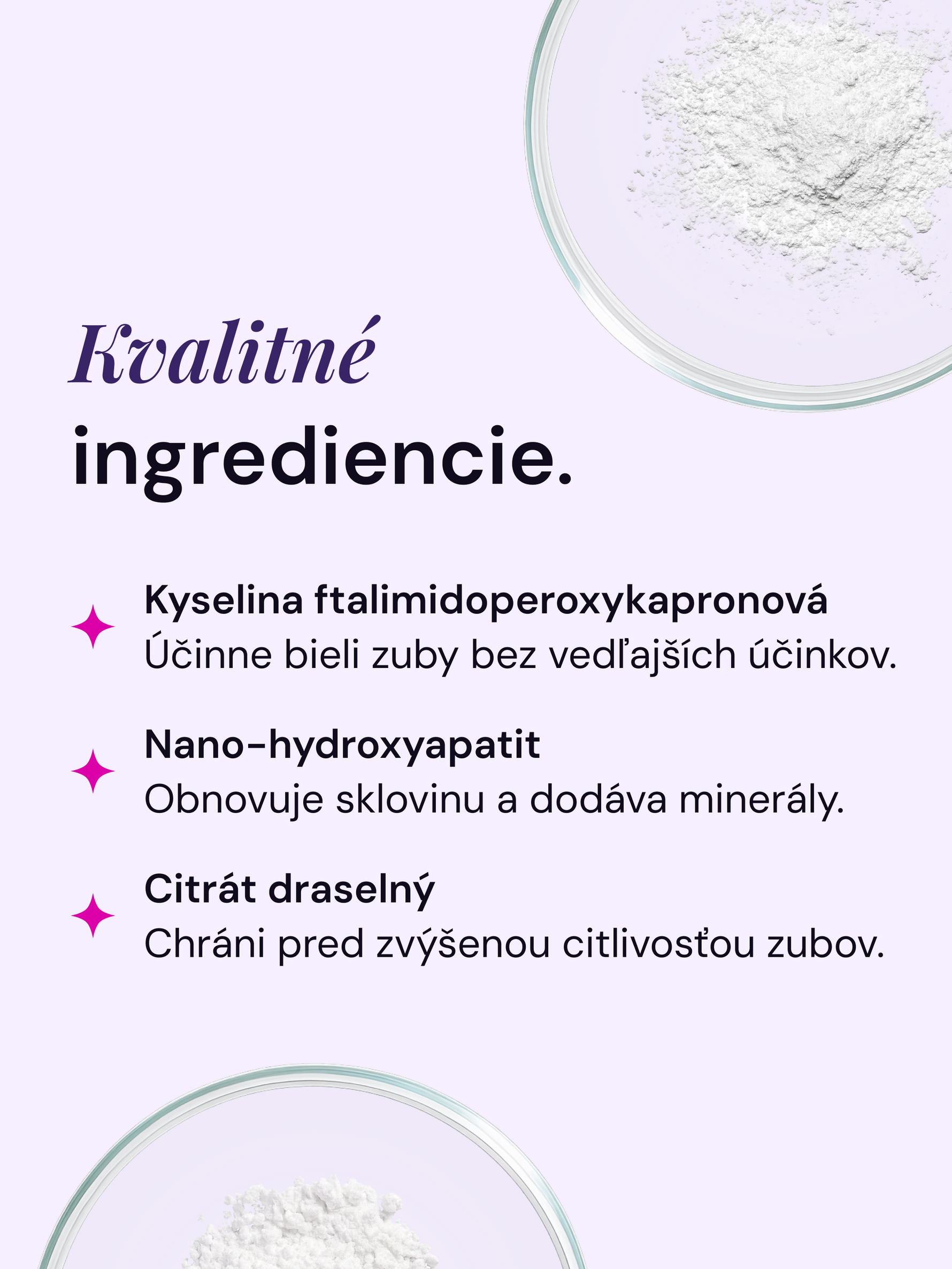 Vedecky overená bieliaca zložka zubov, ktorá je bezpečnou alternatívou peroxidu. PAP nemá pri oxidácii škvŕn na zuboch žiadne negatívne vedľajšie účinky, čo umožňuje účinné bielenie bez bolesti a citlivosti.