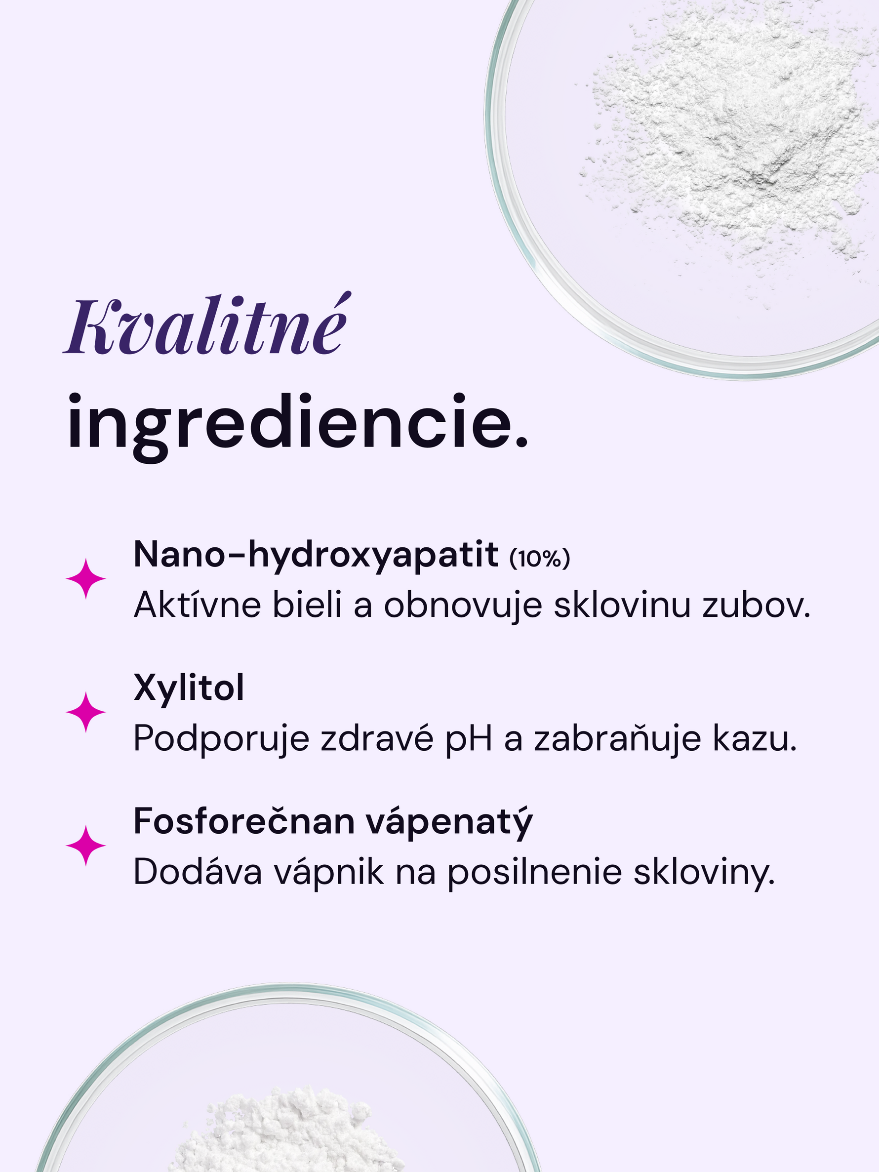 Aqua/voda, fosforečnan vápenatý, glycerín, xylitol, nano-hydroxyapatit, oxid kremičitý, propylénglykol, decylglukozid, celulózová guma, aróma, kremičitan sodný, fosforečnan horečnatý, hydrolyzovaný proteín, cetylpyrindín-diethyléndiaminochlorid.